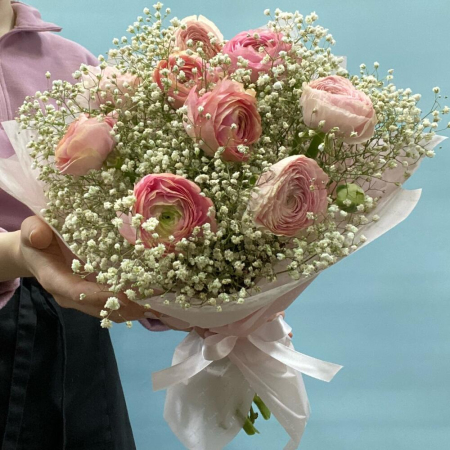 Букет из розовых ранункулюсов с белой гипсофилой в Луховицах